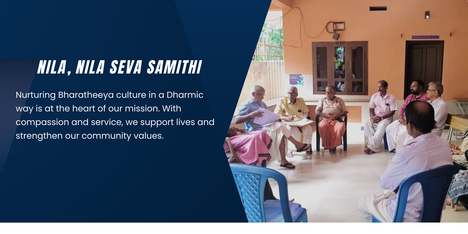 Founded in 2001 (Registration No. 306/2001), Nila Seva Samithi is a Charitable Society dedicated to preserving Bharatheeya culture through a Dharmic approach. Since its inception, Nila has consistently worked to support and uplift the marginalized and disadvantaged members of society. Our commitment to compassion, social responsibility, and community welfare is deeply embedded in everything we do. Nila’s mission is to foster the well-being of the community by safeguarding cultural heritage and providing essential aid to those in need, all while embodying the principles of selfless service and cultural enrichment.